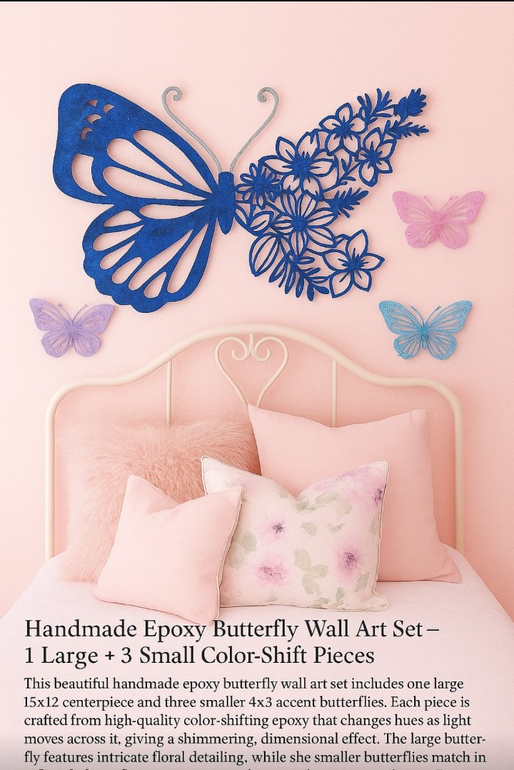 Transform any room with this stunning handmade epoxy resin butterfly set! Includes one large 15×12 centerpiece and three smaller 5×4 accent butterflies. Each piece is crafted from high-quality color-shifting epoxy that changes hue beautifully as light moves across it, creating a shimmering, dimensional look.